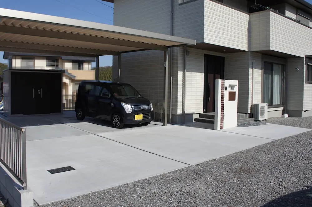 基本は砂利敷きになりますが、“全面舗装”ではなく、車が乗る部分だけをコンクリートにして使いやすくします - 必要な部分の目隠しフェンス設置